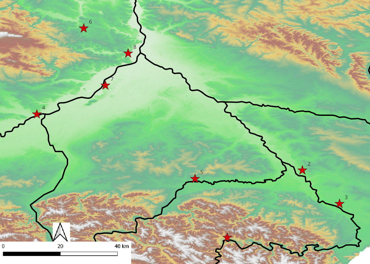 Zdjęcie powyżej: Lokalizacja znalezisk brązowych i żelaznych szczypczyków datowanych na epokę brązu i wczesną epokę żelaza z obszarów polski południowo-wschodniej (podkład Geoportal). 1-Bachórz Chodorówka stan.1; 2-Dybków stan.2; 3- Wietlin III; 4- Zawada stan.1; 5- Jasionka stan.1; 6- Wojnowice stan.42; 7- Tarnobrzeg stan. 5; 8- Dwikozy.