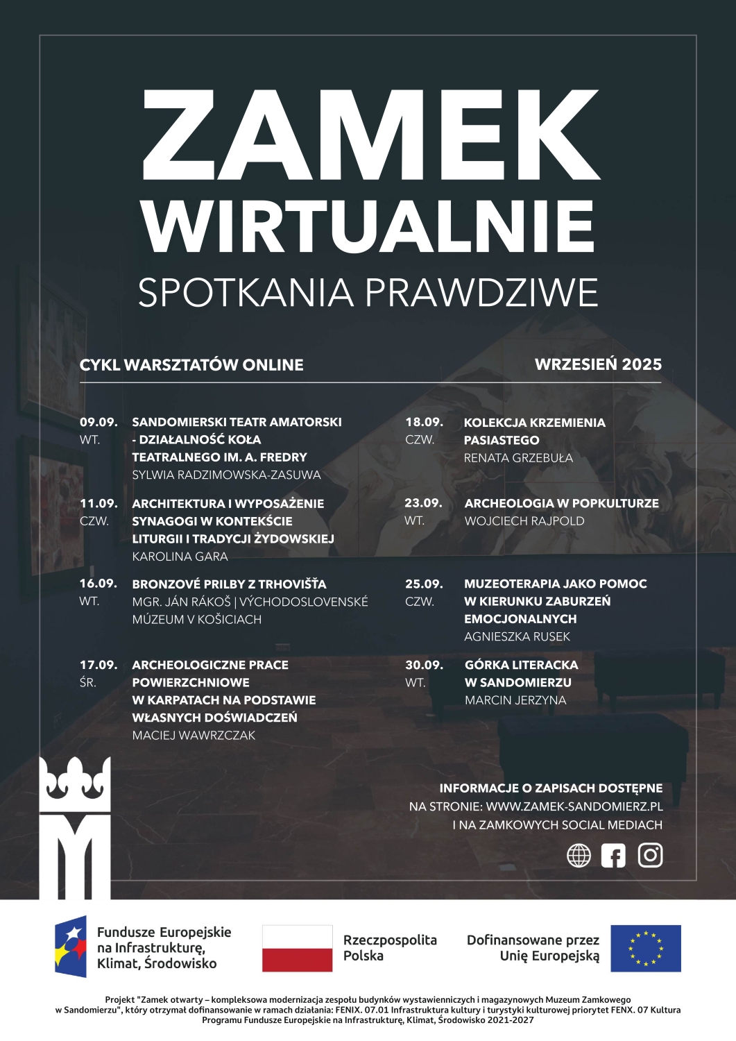 Wydarzenia organizowane w ramach projektu „Zamek otwarty – kompleksowa modernizacja zespołu budynków wystawienniczych i magazynowych Muzeum Zamkowego w Sandomierzu”, który otrzymał dofinansowanie w ramach działania: FENX. 07.01 Infrastruktura kultury i turystyki kulturowej priorytet FENX. 07 Kultura Programu Fundusze Europejskie na Infrastrukturę, Klimat, Środowisko 2021-2027. DOWIEDZ SIĘ WIĘCEJ – TUTAJ