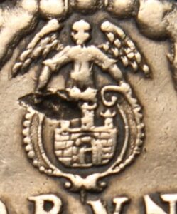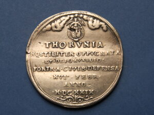 REWERS ma charakter opisowy i pełni funkcję swoistej kroniki wydarzeń. W siedmiu wierszach zapisano informację o oblężeniu miasta oraz jego skutecznej obronie „z Bożą pomocą” przez samych obywateli Torunia, z dokładnym wskazaniem daty – 16 lutego 1629 roku. Pod inskrypcją THORVNIA /HOSTILITER.OPPVGNATA/ ET.DEI O. AVXILIO/ FORTRA. CIVIB. DEFENSA/ XVI FEBR/ ANNO/ M.DC.XXIX (Toruń przez nieprzyjaciela oblężony, z Bożą pomocą dzielnie przez współobywateli obroniony dnia 16 lutego roku 1629) umieszczono dekoracyjną arabeskę.