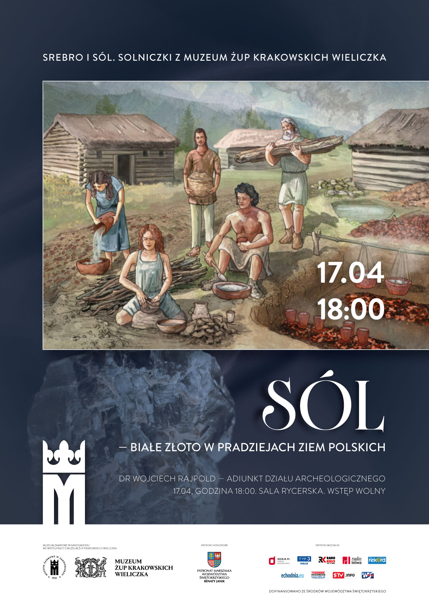Przed nami kolejne wydarzenie towarzyszące wystawie czasowej „Srebro i sól. Solniczki z Muzeum Żup Krakowskich Wieliczka”. Tym razem 17.04. (piątek), o godzinie 18:00 odbędzie się wykład dra Wojciecha Rajpolda – Adiunkta Działu Archeologicznego Muzeum Zamkowego w Sandomierzu zatytułowany „Sól – białe złoto w pradziejach ziem polskich”. Wstęp wolny.
