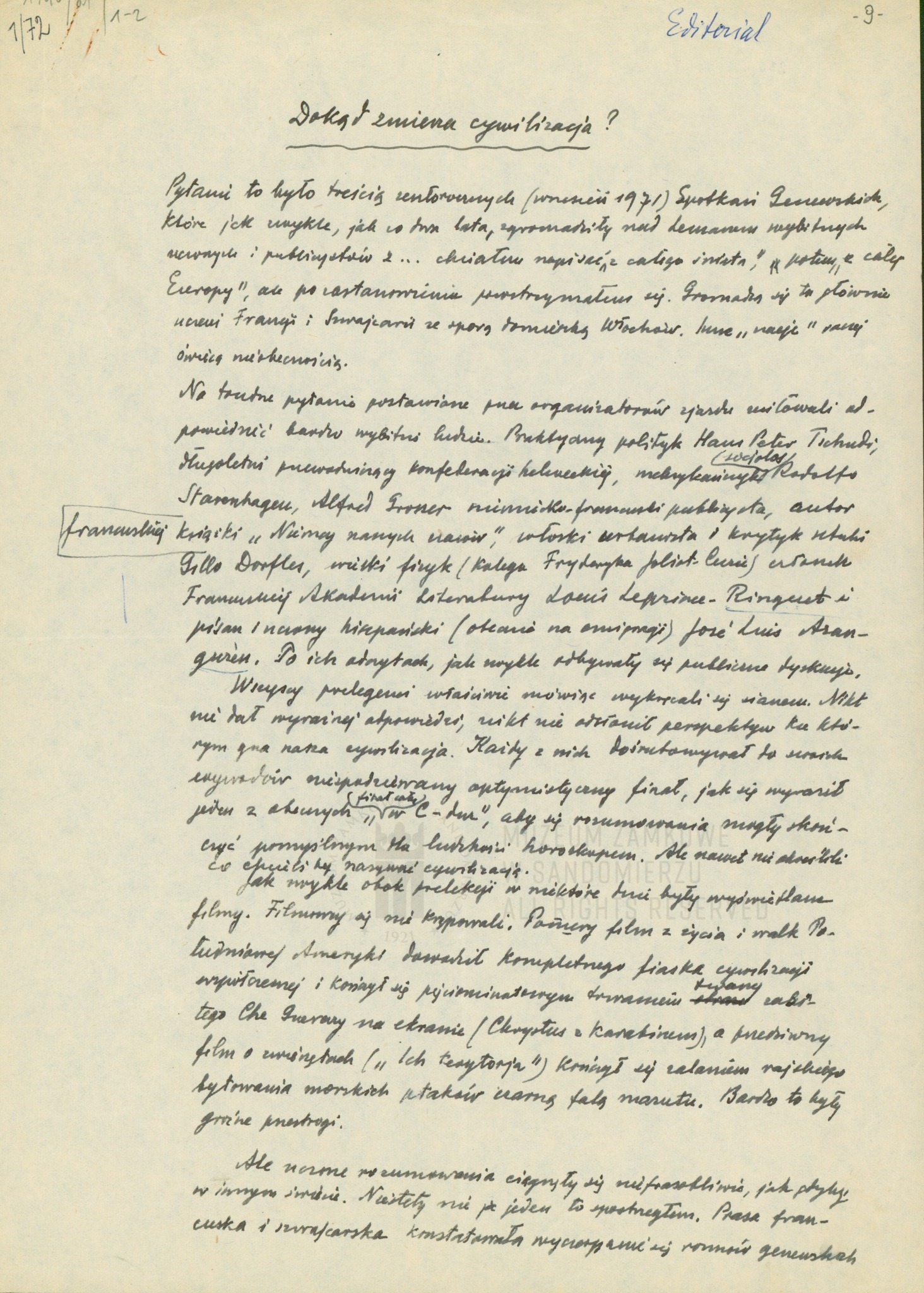 Miejsce tworzenia: Polska. Data powstania: 1972. Numer inwentarzowy: MLS/230 Tworzywo: papier. Technika: rękopis. Wymiary: 21 cm x 29.5 cm. Rękopis zawiera 2 kartki. Zakupiony od miesięcznika „Twórczość” z siedzibą w Warszawie. Jeden z rękopisów-editoriali znajdujący się z zbiorach Działu Literatury Muzeum Zamkowego w Sandomierzu. To relacja Iwaszkiewicza ze spotkanie literatów i działaczy kultury, które odbyło […]